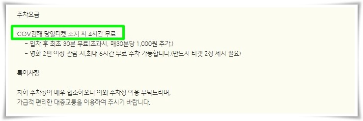 김해cgv 주차요금의 경우 안내되어 있는 것처럼 당일 영화 관람객은 4시간 무료주차가 가능합니다. 영화두편이상 관람 시 6시간까지 가능하다고 하는데.