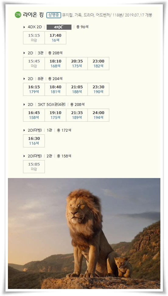 김해cgv 상영시간표를 보면 라이온 킹 다음으로 인기가 많은 영화가 무엇인지 한눈에 알 수 있을 거랍니다.
