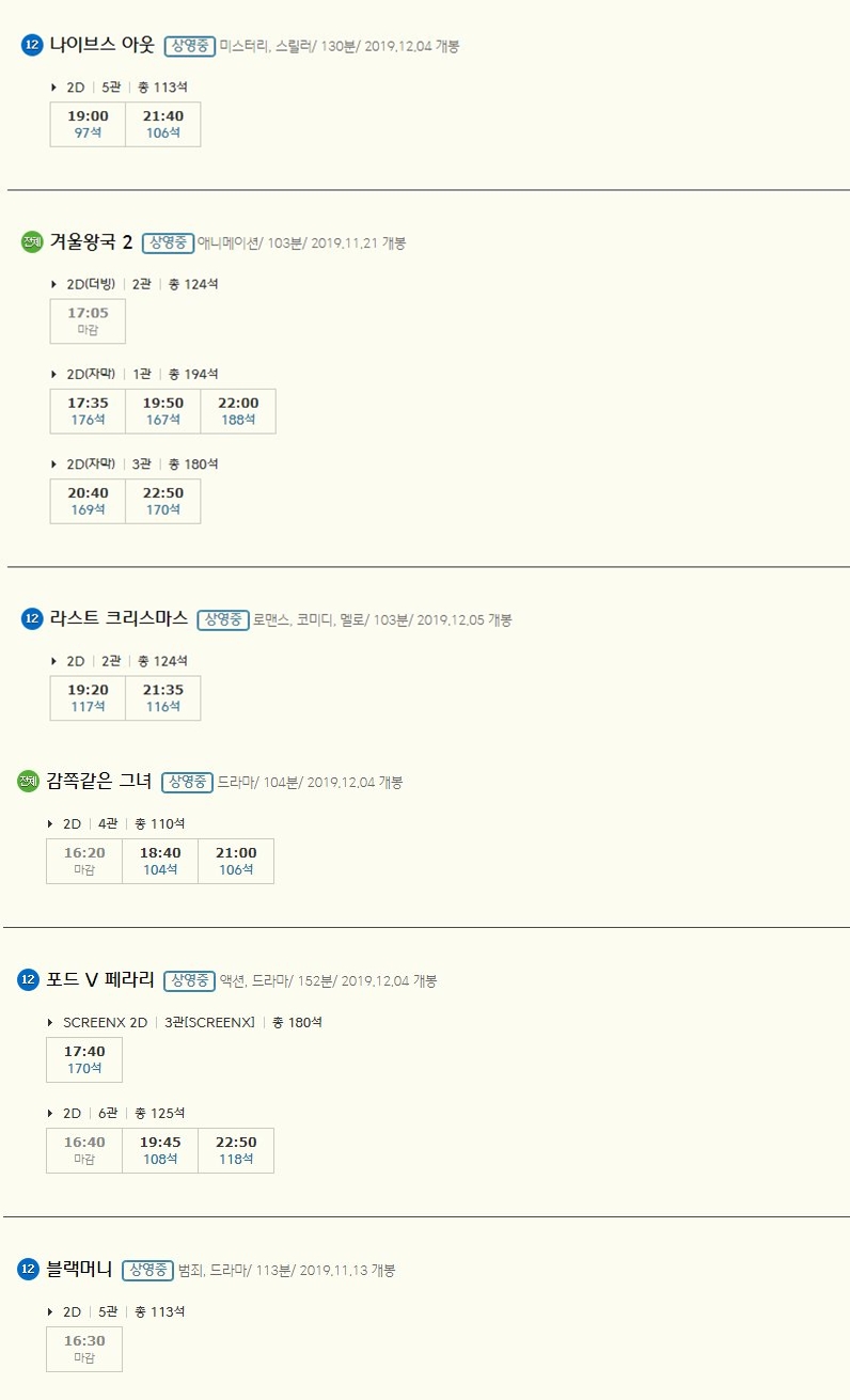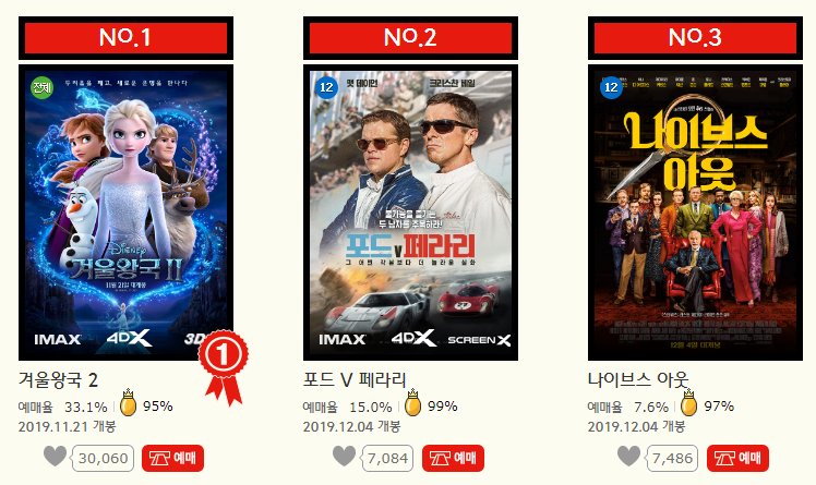 현재 개봉한 많은 영화들중에 영화예매 순위를 살펴보면 겨울왕국2, 포드 V 페라리, 나이브스 아웃이 영화예매 순위에서 상위권을 달리고 있습니다.