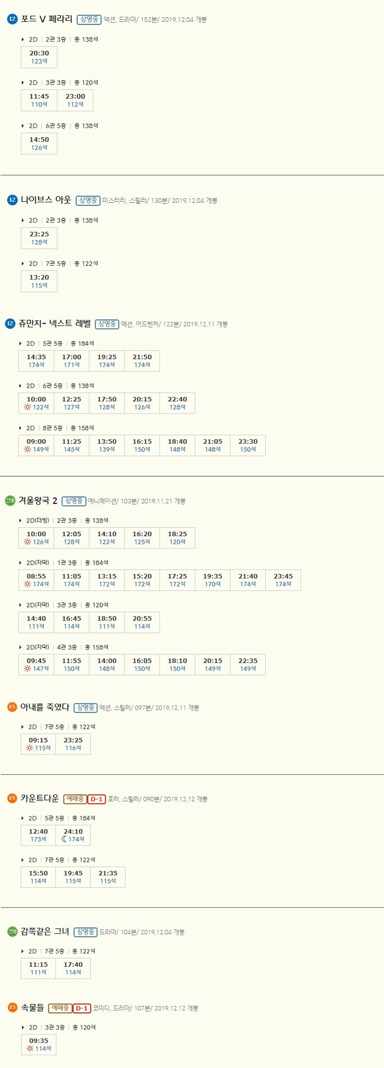 이밖에도 경기광주 cgv 상영시간표를 살펴보면 포드 v 페라리, 나이브스 아웃, 쥬만지, 겨울왕국 2, 카운트 다운, 속물들, 감쪽같은 그녀 등 주목 할만한 작품들이 많이 있습니다.