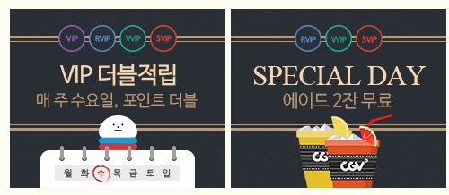 매주 수요일 cgv 멤버십에 가입되어 있는 분들의 경우 vip등급은 더블적립을 해주고 있습니다. 또한 에이드 무료, 포인트 반값 할인 등의 이벤트도 있으니 잘 참고하시기 바랍니다.