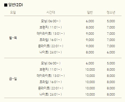 일반 상영관과 2D, 3D, 4D 영화의 요금또한 다르니 영화예매 전 확인하시기 바랍니다.