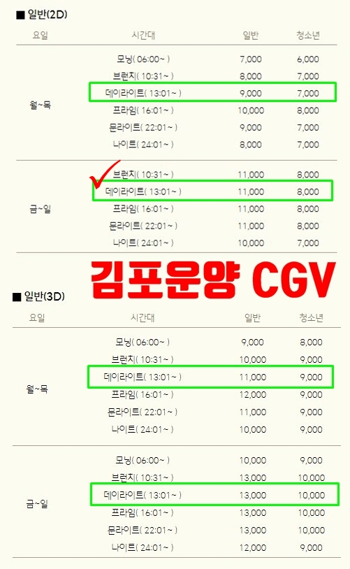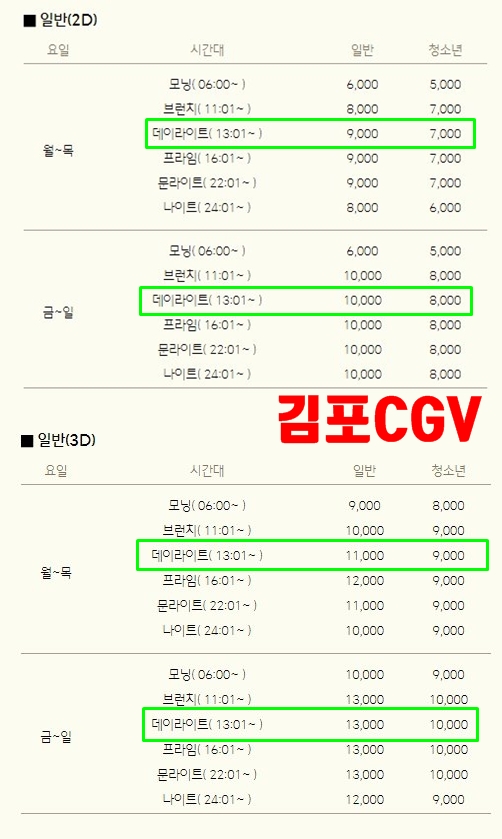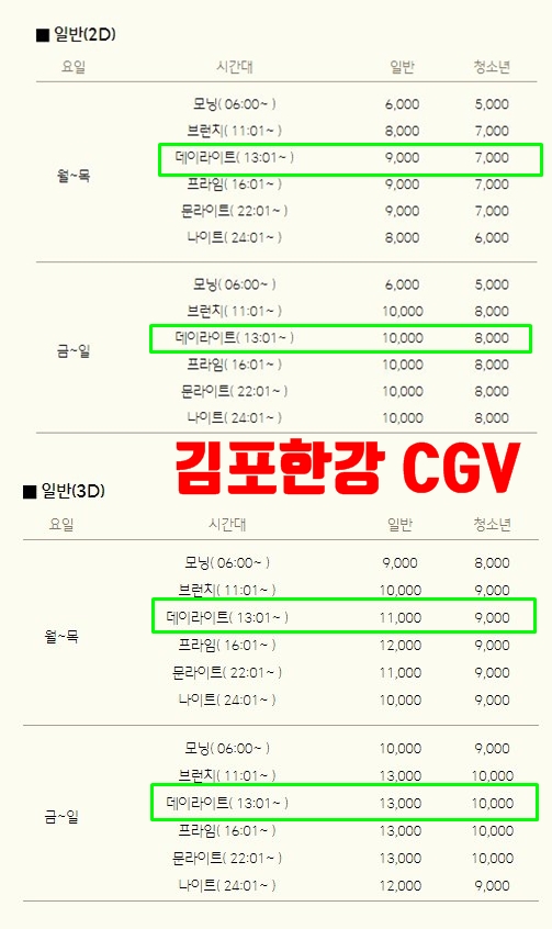 그렇다 보니 같은 지역에 있는 영화관중에서도 가격차이가 나는 부분이 있어 김포지역 영화관 관람요금을 정리해 봤다.