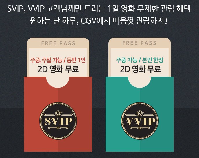 CGV VIP 회원들에게만 해당되는 행사인데요 1년동안 영화 관람 누적액에 따라 포인트가 적립되며 이러한 포인트로 CGV 멤버십 등급을 선정하게 됩니다.