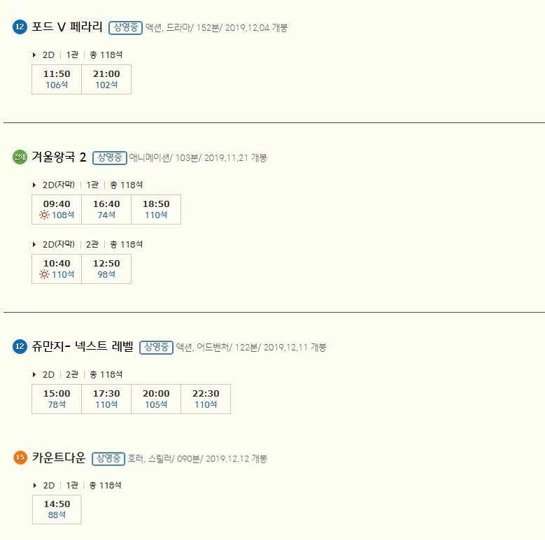 남포 CGV 상영시간표를 살펴보면 주말인 오늘 총 4편의 영화가 상영중으로 소개되고 있습니다. 천만 관객을 돌파한 겨울왕국 2편, 쥬만지, 포드 V 페라리, 카운트다운입니다.