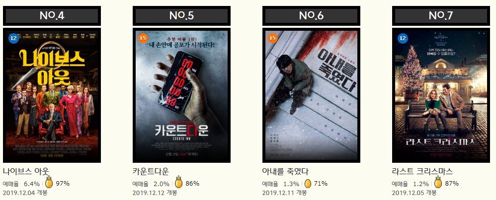 이밖에도 나이브스 아우스 카운트다운, 아내를 죽였다, 라스트 크리스마스 등이 뒤를 잇고 있습니다.