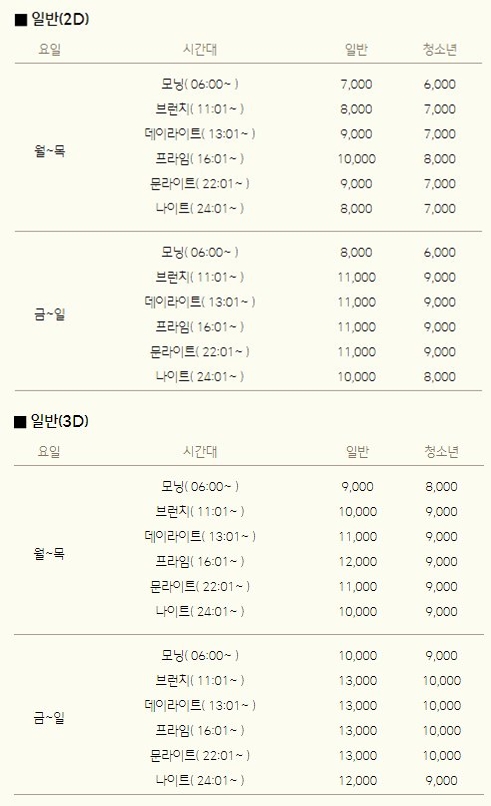 또한 일반 영화 이외에 3D 영화, SWEETBOX의 영화요금이 다르기 때문에 영화예매 시 참고하는 것이 좋다.