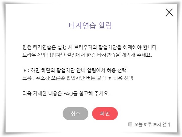 혹시라도 타자연습 창이 열리지 않는 경우 다음과 같은 환경설정을 하라는 안내 팝업창이 나오는 것을 확인할 수 있다.