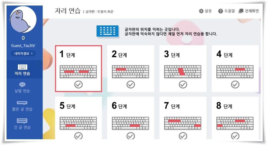 순서에 맞춰 하나씩 자이를 익혀가고 점차 익숙해지면 낱말연습, 단문, 장문식으로 연습해 가면서 자판을 익힐 수 있도록 단계가 구성되어 있는 것을 알 수 있다.