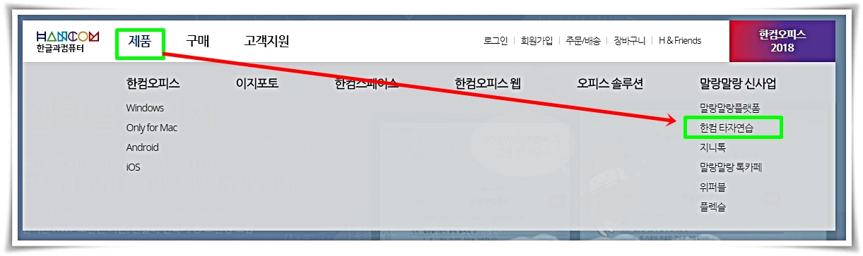 다운로드 없이 사용할수 있는 방법이야말로 그러한 분들에게도 좋은 정보가 되지 않을까 생각한다. 홈페이지 제품 카테고리에 들어가면 한컴타자연습을 확인할 수가 있다.
