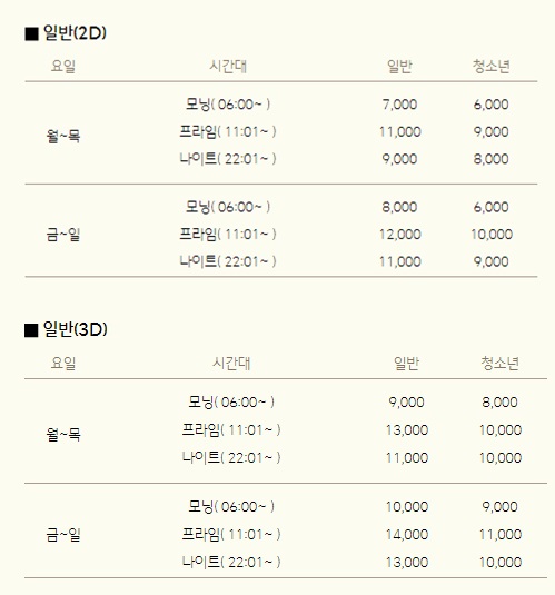 CGVD의 경우 특히 영화 시간대에 따라서 영화요금이 다른 점이 특징이라 할 수 있습니다. 프라임 시간의 경우 11,000원 나이트 시간의 경우 9,000원입니다.