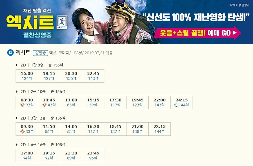 | 세종CGV 상영시간표 : 이번달 영화 예매순위 (0) | 2019.08.04 |