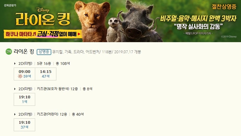 7월 17일 개봉한 라이온 킹은 오늘 총 4편의 상영이 예정되어 있습니다. 방학을 맞이하면서 더욱 많은 사랑을 받고 있습니다.