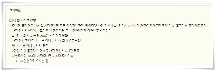 인천 CGV 주차요금의 경우 당일 관람객들에게 4시간에 2000원의 요금을 받고 있습니다. 아쉽게도 무료주차가 없는 점이 단점인 것 같습니다.
