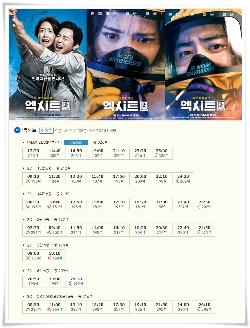 제일 먼저 눈에 띄는 것은 엑시트입니다. 오늘 하루 상영 예정만 47번 예정되어 있습니다. 아무리 방학이라고 하지만 평일에 이 정도로 상영하는 것을 보면 올여름 최고의 흥행작이 아닐까 생각합니다.