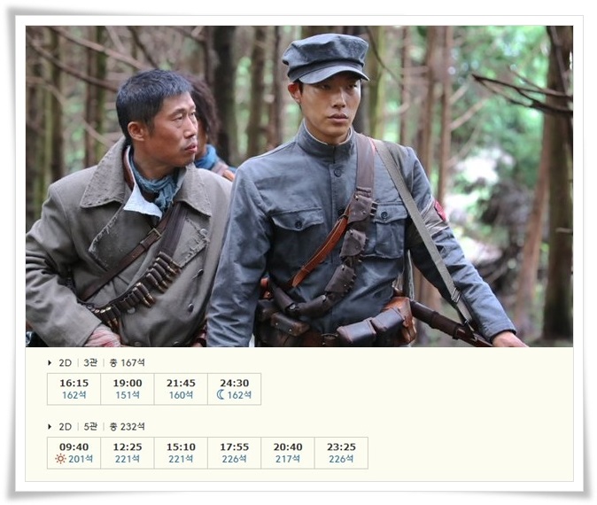 개봉 첫날 봉오동 전투는 총 10번의 상영이 예정되어 있습니다. 오전 9시 40분 영화를 시작으로 심야 영화인 24시 30분 영화까지 다양한 시간대 상영 중입니다.