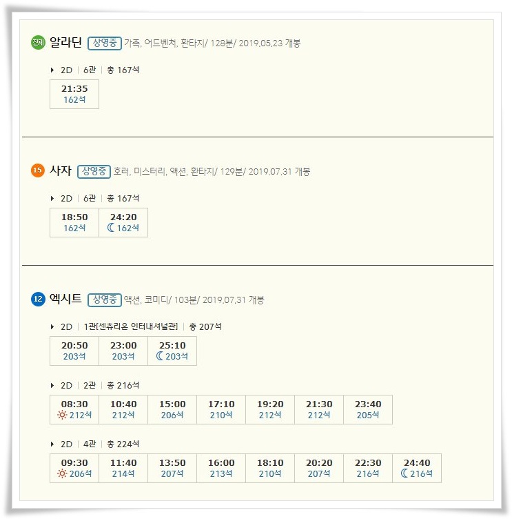 현재 최고의 흥행가도를 달리고 있는 엑시트와 사자, 알라딘도 상영 중입니다.