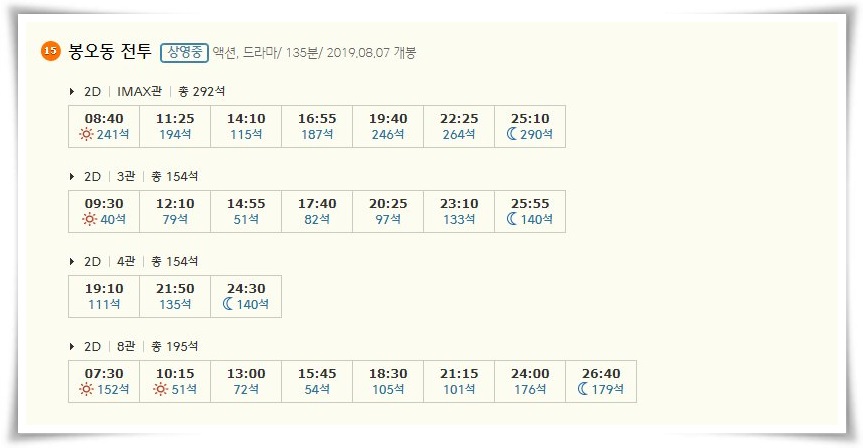 영화 예매율 2위답게 봉오동전투 또한 많은 상영이 예정되어 있습니다. 오늘만 25번의 상영이 예정되어 있습니다.
