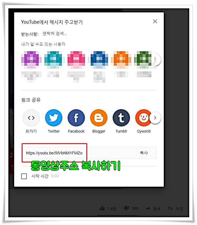 유튜브 동영상을 보면 공유 버튼이 있는데 공유 버튼을 누르면 해당 동영상 링크를 확인할 수가 있습니다.