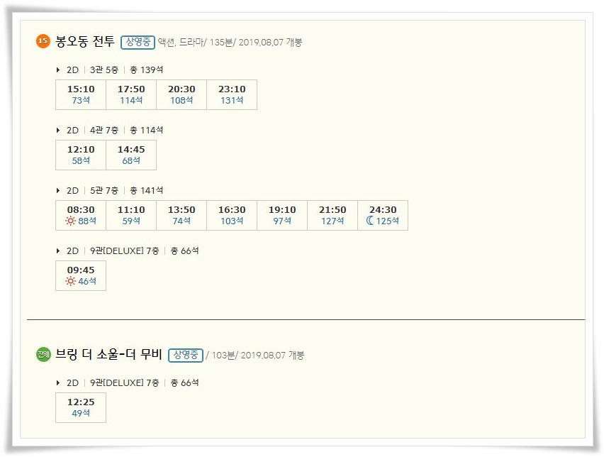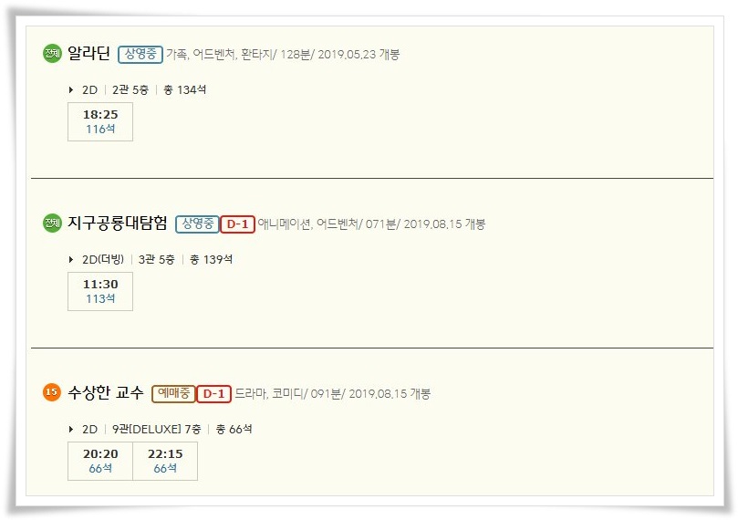 | 대전cgv 상영시간표 영화예매순위 및 할인혜택 안내 (0) | 2019.08.16 |