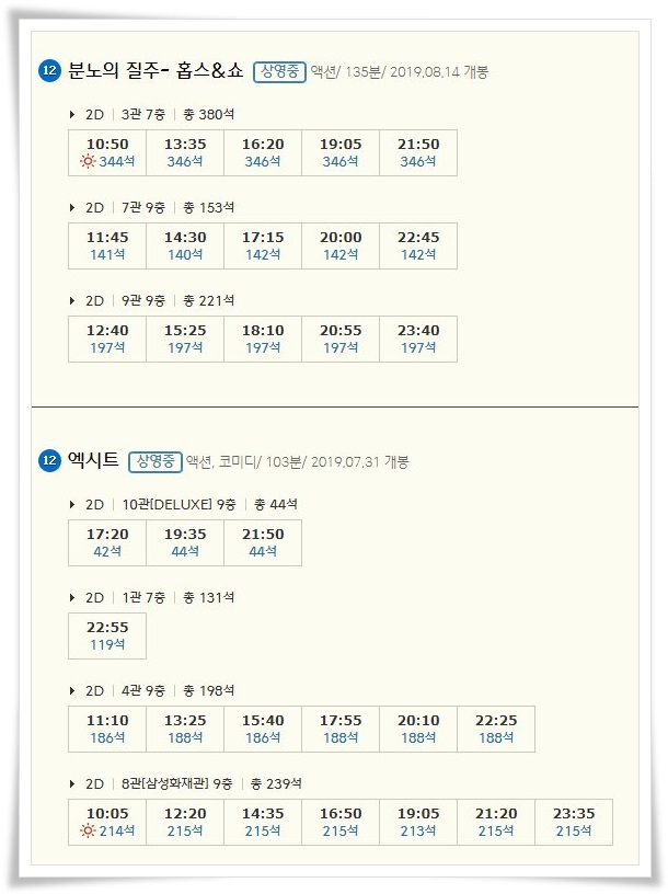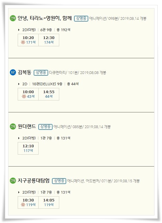 다음은 8월 19일(월) 기준 영화 시간표입니다. 영화예매 시 참고하시기 바랍니다.