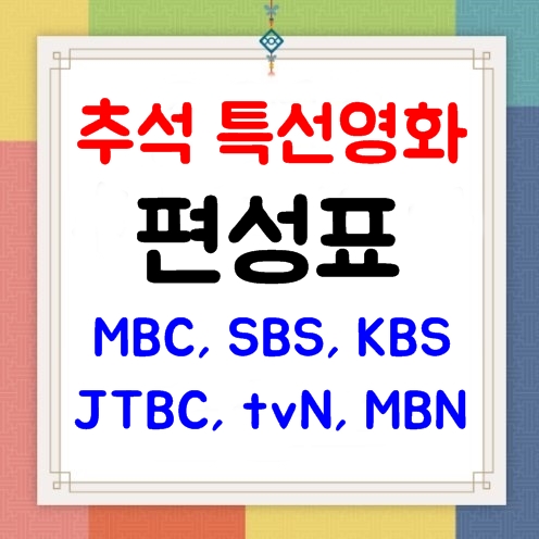 SBS 추석 특선영화 및 MBC 추석 특선영화 등 종합편성 채널에서도 많은 영화들이 상영 예정이니 추석 연휴 기간 동안 즐겁게 관람하시고 안전한 귀경길과 즐거운 한가위 명절 보내시기 바랍니다.