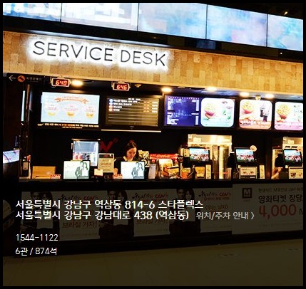 cgv 강남점은 강남구 역삼동 스타플렉스 건물에 위치하고 있습니다. 전체 상영관은 총 6개로 구성되어 있으며 총 874석의 인원을 수용할수 있습니다.