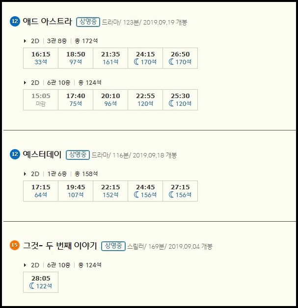 새로 개봉한 영화인 애드 아스트라는 오늘 하루 총 10번의 상영이 예정되어 있습니다.