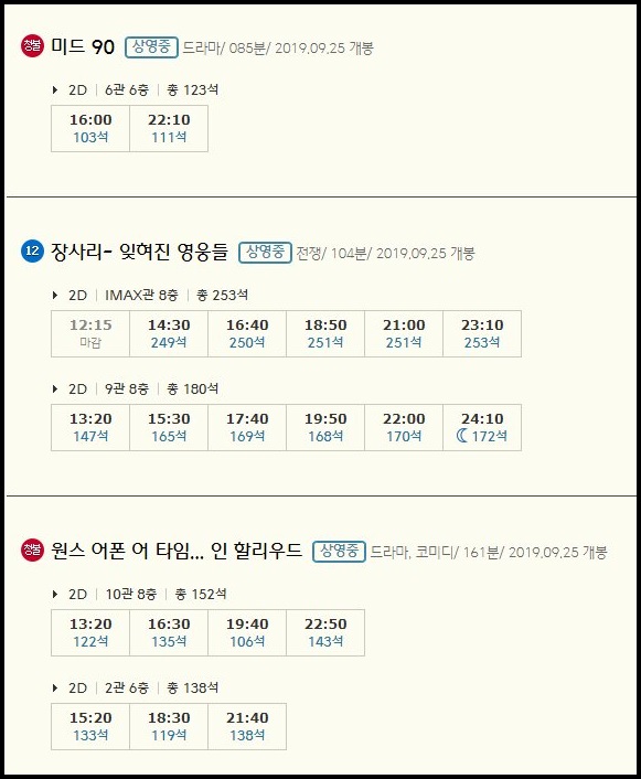 구로 CGV 상영시간표, 현재상영작 영화예매 순위 (0) | 2019.09.23 |