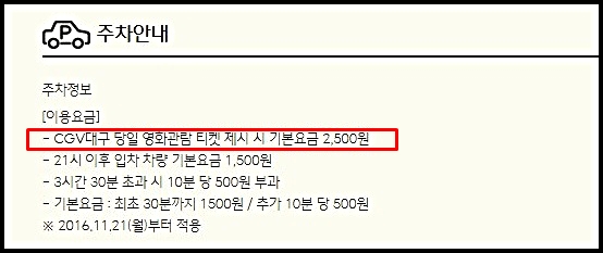 대구 cgv 주차요금의 경우 당일 영화관람객들에게 3시간 30분까지는 기본요금인 2,500을 받고 있습니다.