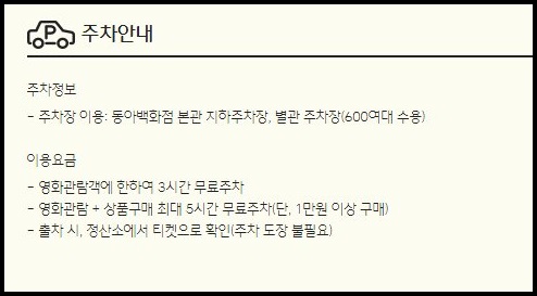 당일 영화 관람객들의 경우 3시간의 무료주차가 가능합니다.