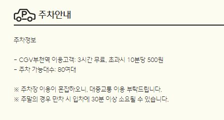 부천 cgv 주차자은 당 건물 지하에 주차가 가능합니다. 주차 가능대수가 80여 대 정도밖에 되지 않아서 주말의 경우 주차하기가 어려울 수도 있습니다.
