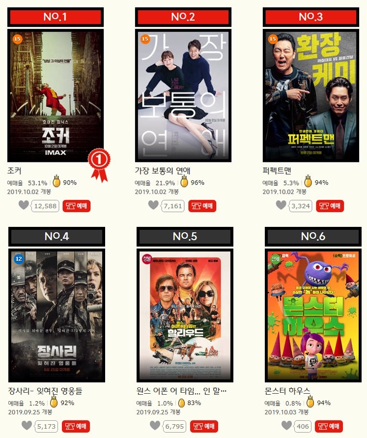 개봉 이후부터 현재까지 CGV, 메가박스, 롯데시네마에서도 조커는 예매순위 1위를 달리고 있습니다.