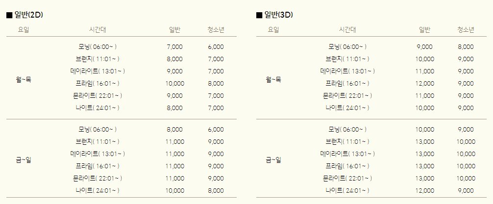또한 2D, 3D 영화에 따라 영화 관람료가 다르게 적용되고 있습니다.