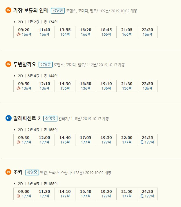 현재 상영작들은 가장 보통의 연애, 두 번 할까요, 말레피센트 2, 조커입니다.