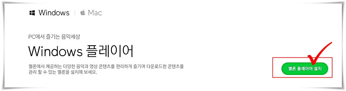 필자의 경우 Window 플레이어를 다운받으려고 한다. 내 컴퓨터에 맞는 프로그램을 선택 후 멜론 플레이어 설치 버튼을 누르기만 하면 멜론 프로그램이 다운로드가 된다.