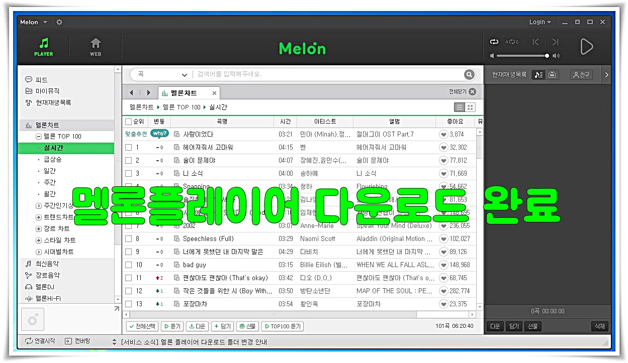 그런데 pc에서라면 조금 귀찮아도 처음에 멜론플레이어 다운로드를 하아야만 음악을 들을 수가 있다.