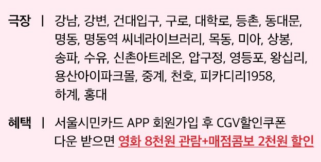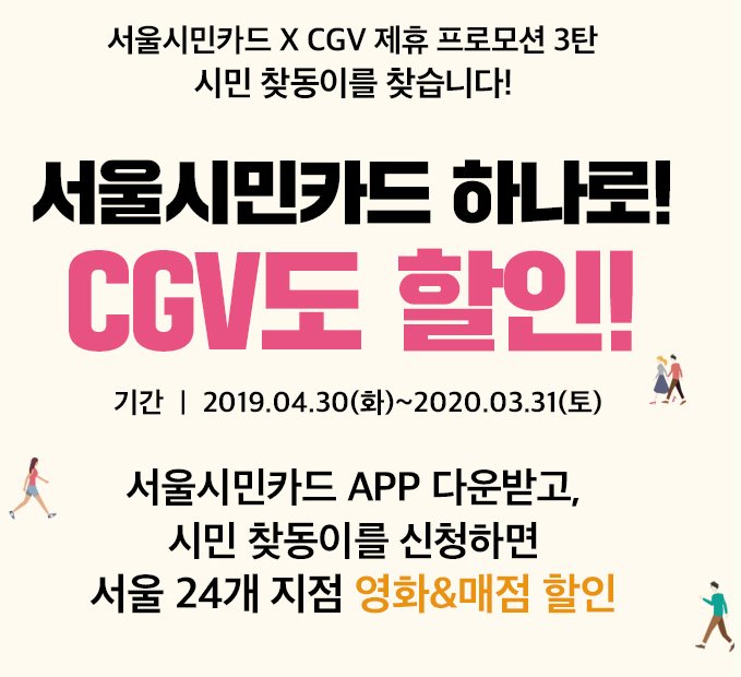 이 외에도 현재 송파 cgv 홈페이지를 살펴보면 서울시민카드 cgv 제휴 프로모션이 진행 중인데 어플 다운로드 시 다양한 혜택을 제공하고 있다고 하니 참고하시기 바랍니다.