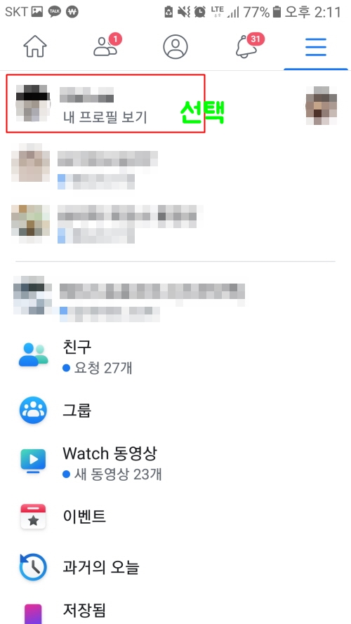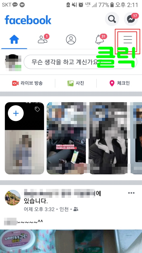 대부분 핸드폰으로 접속을 많이 하기때문에 모바일버전으로 소개하겠습니다. 페이스북 계정에 접속하면 우측 상단에 더보기 버튼이 있으니 클릭해 보시기 바랍니다.