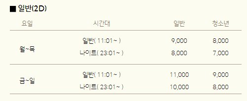 배곧 cgv 영화요금을 살펴보면 주중과 주말 약간의 차이를 보이고 있습니다. 평일보다 주말요금이 2,000원 정도 비싸다고 할 수 있습니다.