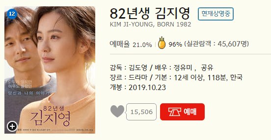 세 영화 모두 최근 개봉하면서 많은 관심을 받고 있기도 하지만 특이한 점은 여성 관객들의 경우 82년생 김지영을 남성 관객들의 경우 터미네이터 영화 예매율이 높다고 합니다.