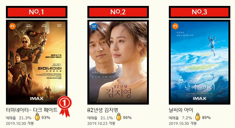 현재 박스오피스 예매순위 1위는 터미네이터 다크 페이트입니다. 2위는 82년생 김지영이 차지했으며 3위는 날씨의 아이입니다.