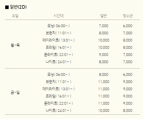 주중 및 주말의 영화 관람 요금의 경우 조금 차이를 보이고 있습니다. 또한 매 시간대 별로 조금씩 차이가 있는데요 상영시간에 따라서 영화요금이 달라진다는점 참고하시기 바랍니다.
