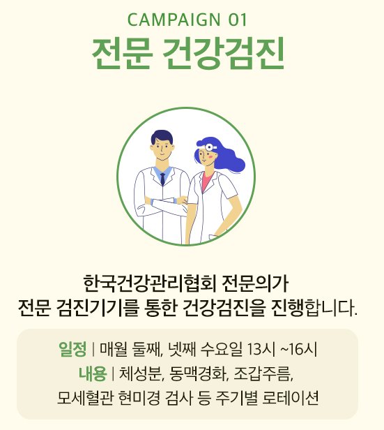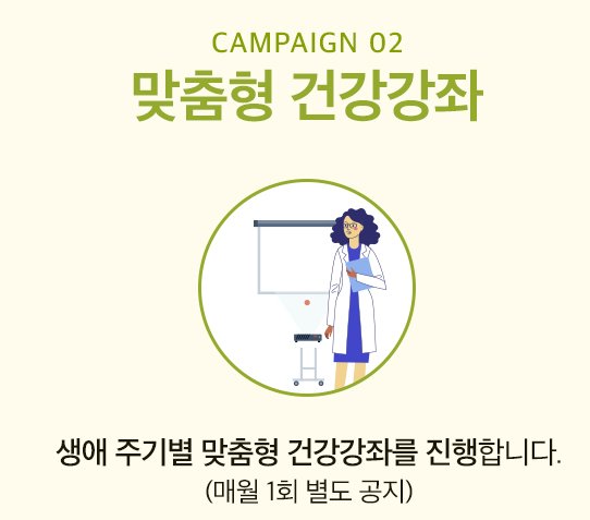 맞춤형 건강강좌부터 아이들 대상 건강체크도 진행하고 있으니 한번 이용해 보시는 것도 좋을 것 같습니다.