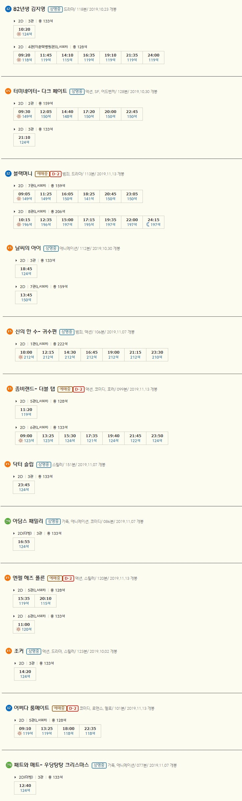 현재 많은 개봉작들이 상영 중입니다. 82년생 김지영, 터미네이터 다크 페이트, 날씨의 아이, 신의 한 수등 볼거리가 많습니다.
