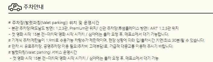 압구정 CGV 는 발레파킹을 제공하고 있는 점도 특별하다고 할 수 있습니다. 주차 타워에 주차를 하기 때문에 이용제한이 있는 차량도 있다는 점 참고하시기 바랍니다.