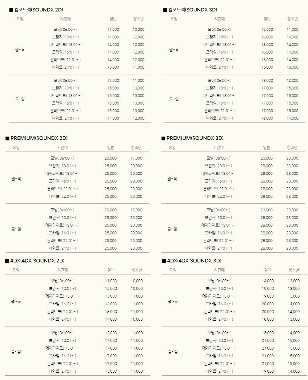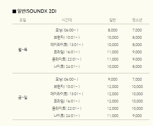 각각 일반 상영관과 영화요금이 다르게 책정되어 있습니다. 일반 상영관 요금 또한 주중 및 주말에 따라 관람요금이 달라지며 매일 시간대마다 다르게 정해져 있습니다.