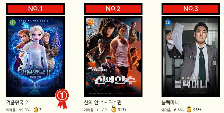 개봉 전임에도 불구하고 겨울왕국 2 편이 예매순위 1위에 올라있는 점이 특징입니다.