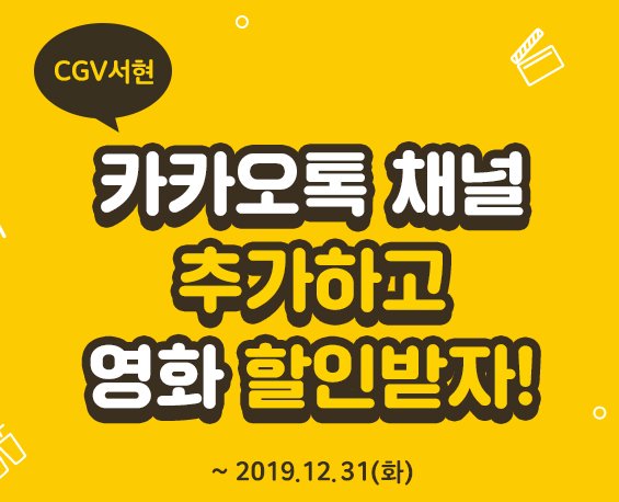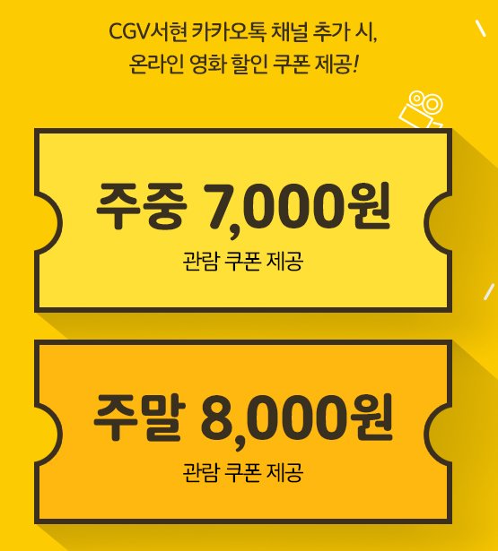 현재 cgv 서현점에서 진행되고 있는 이벤트를 살펴보면 카카오톡 친구 추가 시 영화티켓을 할인해 주는 이벤트가 진행되고 있습니다.
