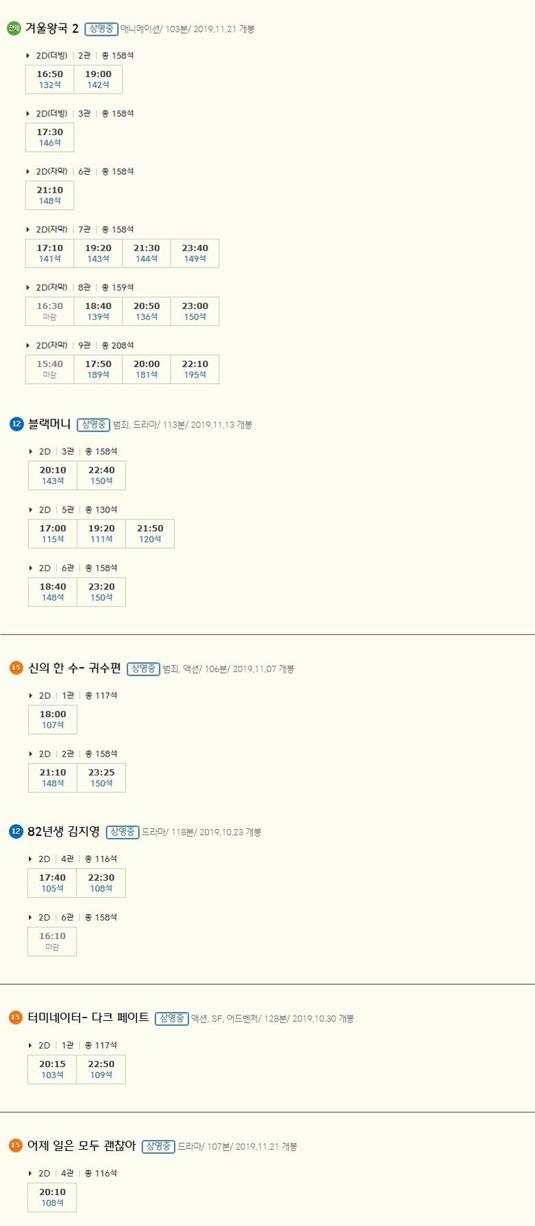 겨울왕국 이외에도 블랙머니, 신의 한 수 귀수편, 터미네이터 다크 페이트, 어제 일은 모두 괜찮아, 82년생 김지영 등 인기 있는 영화들이 상영 중이라 할 수 있습니다.